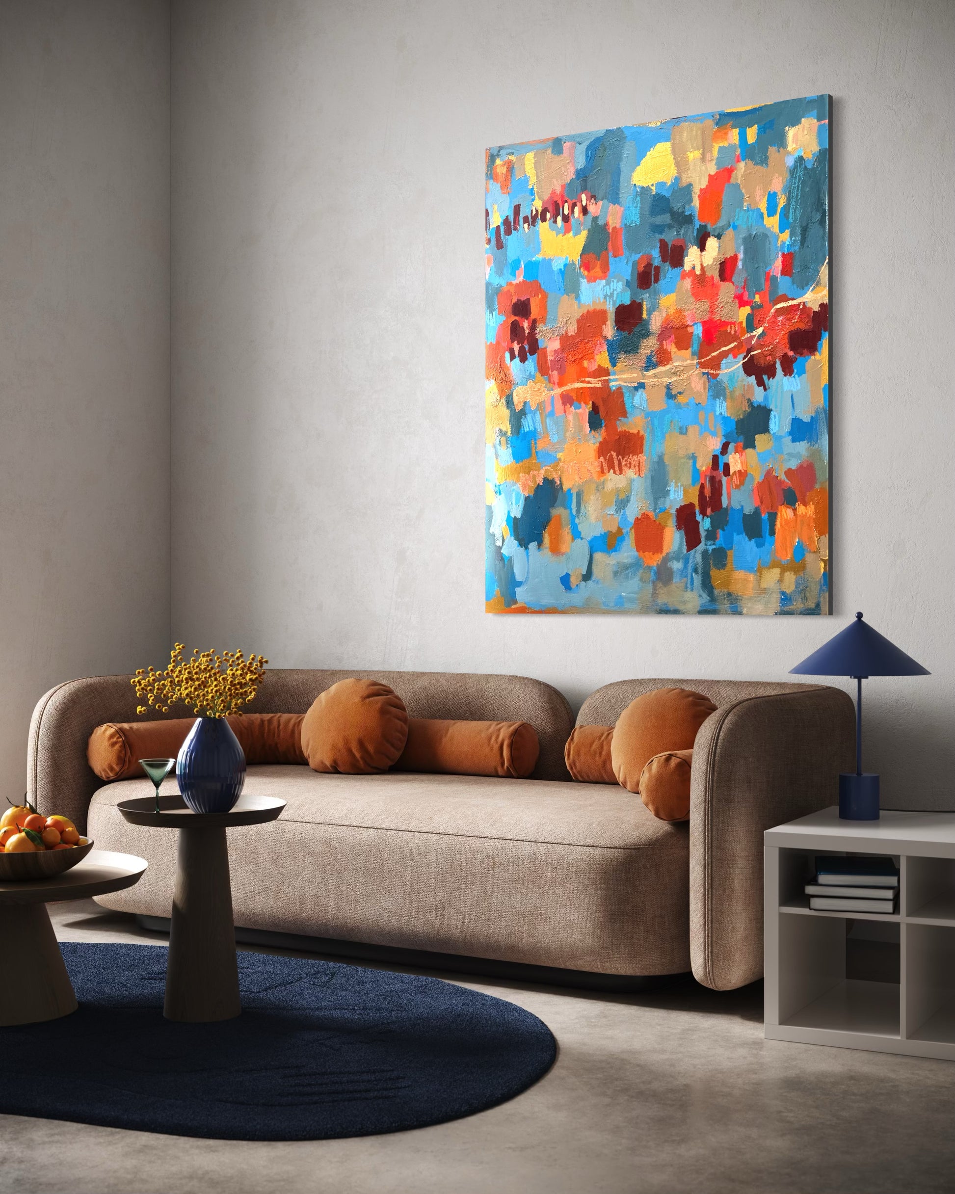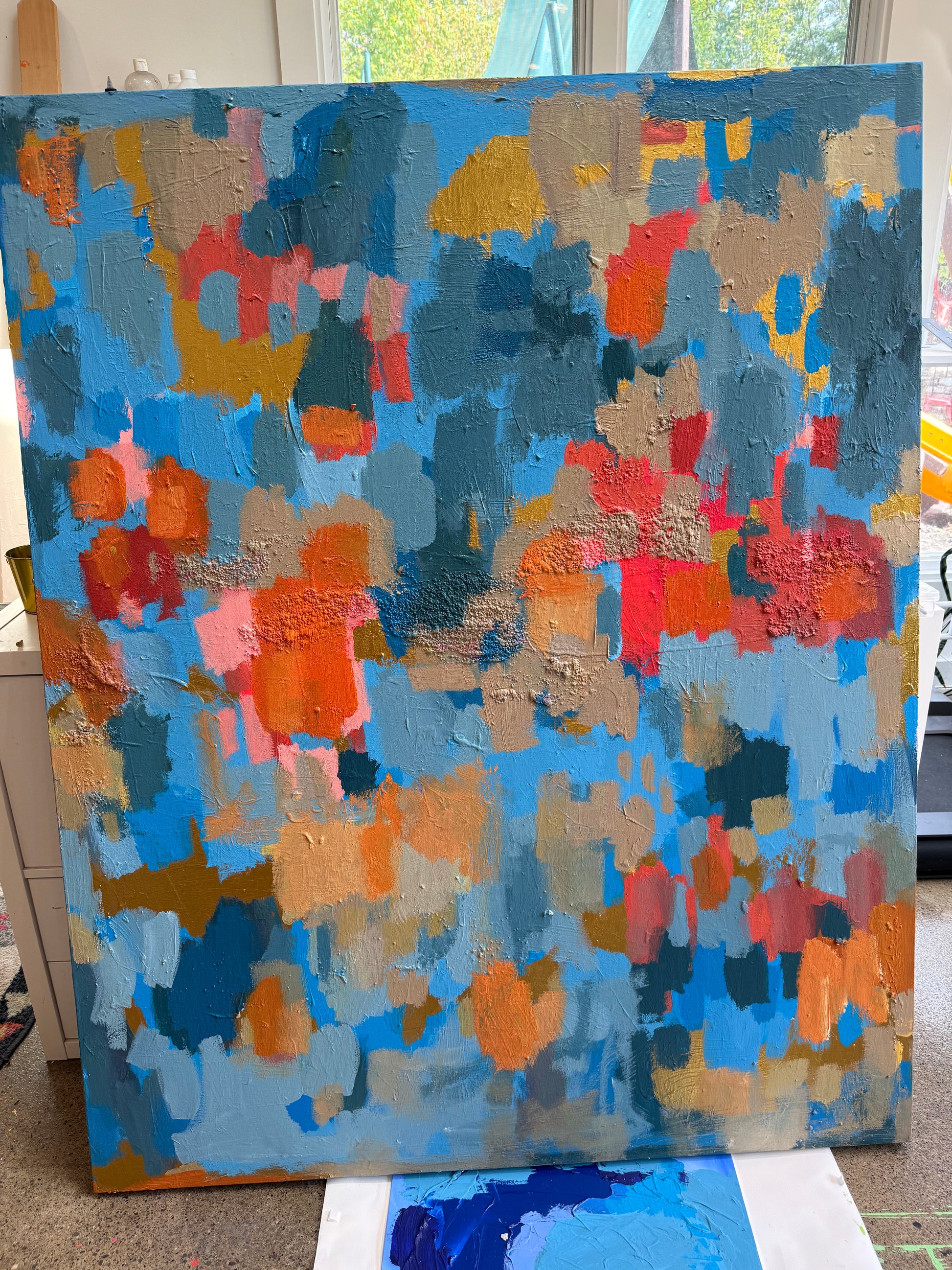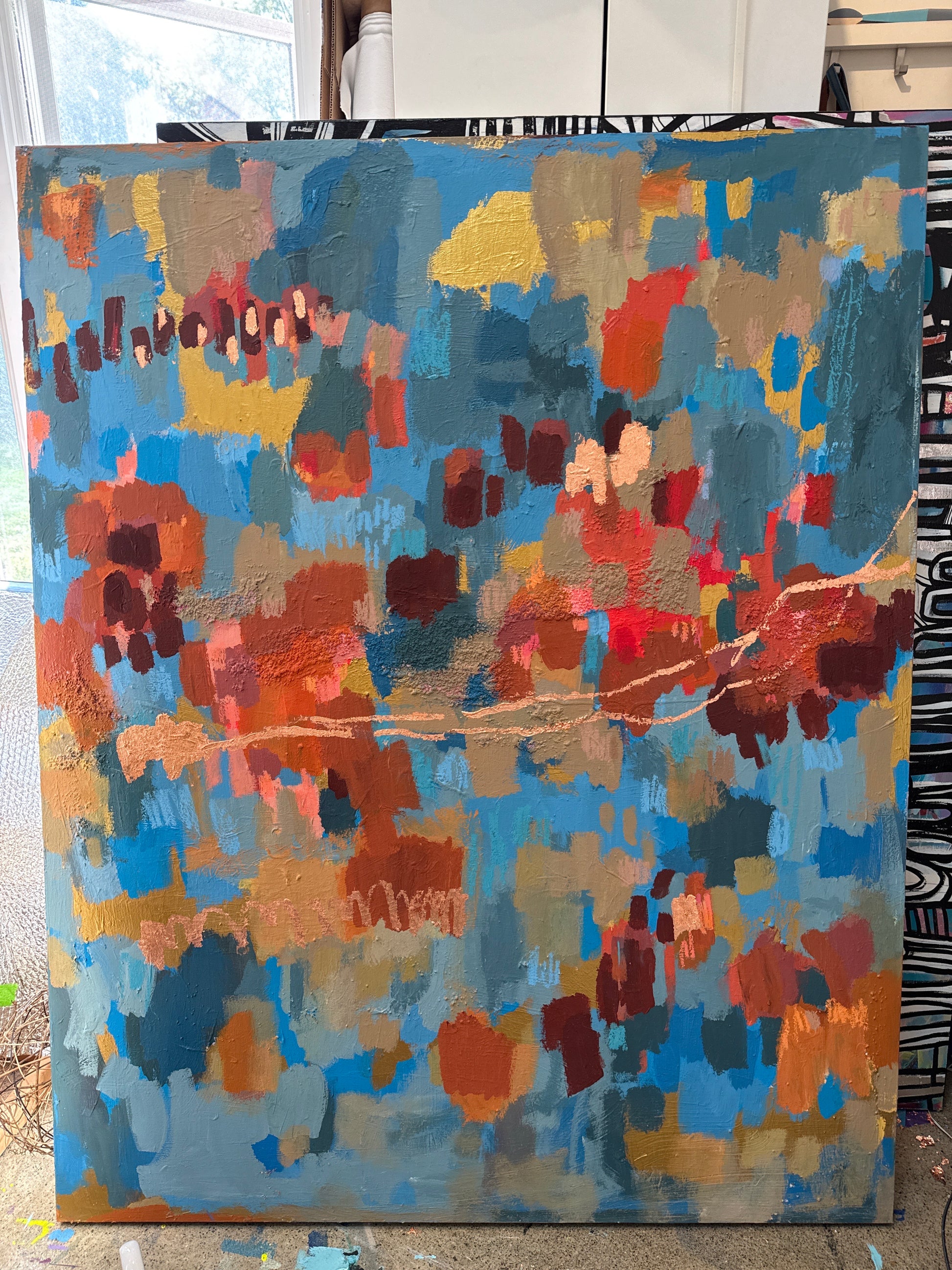 This artwork is inspired by the essence of monarch butterflies, featuring rich hues of burnt orange, gold, rust, and sky blue that capture the feeling of wings soaring gently through time and distance. Monarchs follow the sun and their inner guidance on their journey. "Emergence" portrays this flight alongside a landscape that offers a sense of grounding, hope, and peaceful arrival. 🦋