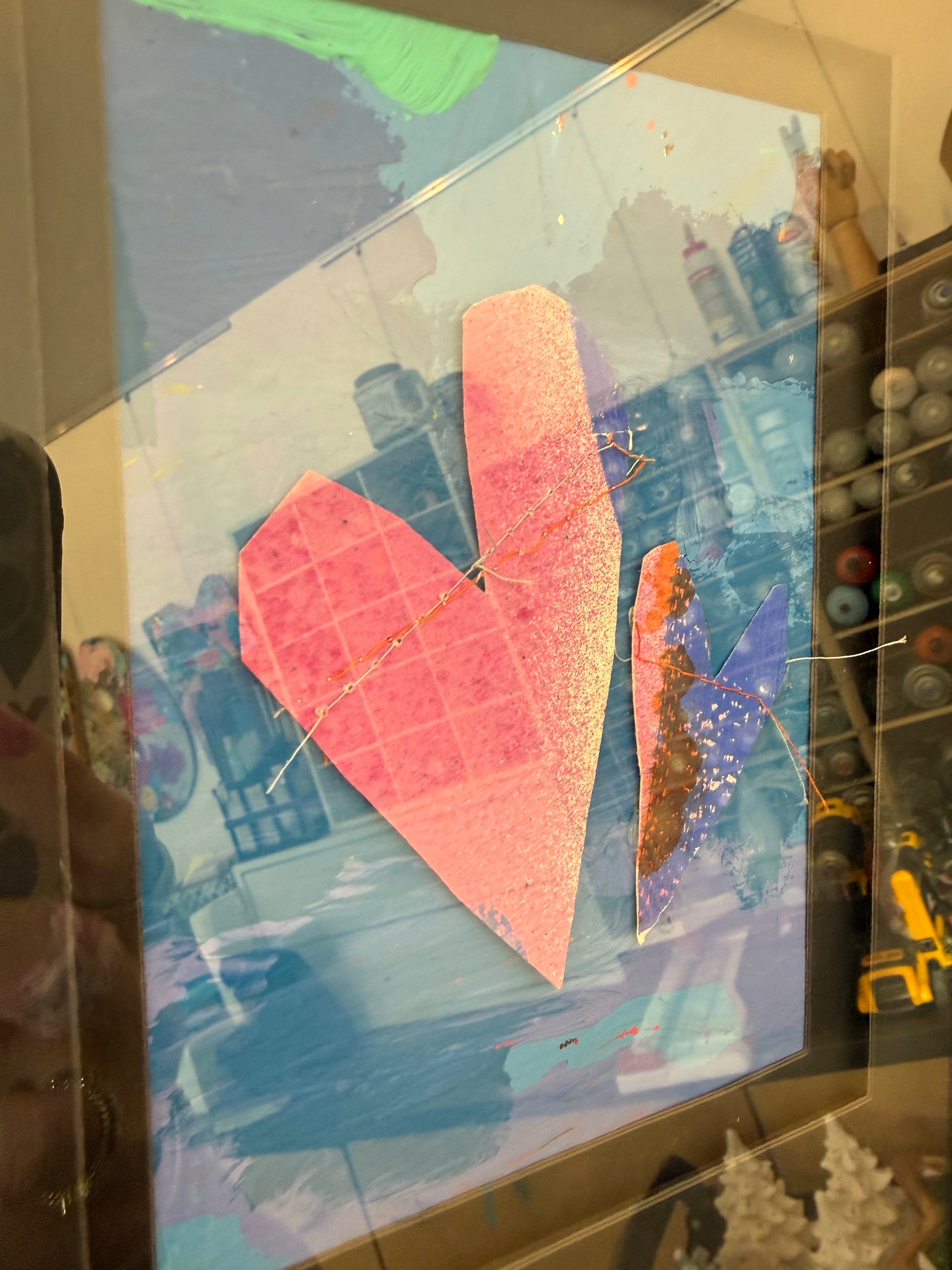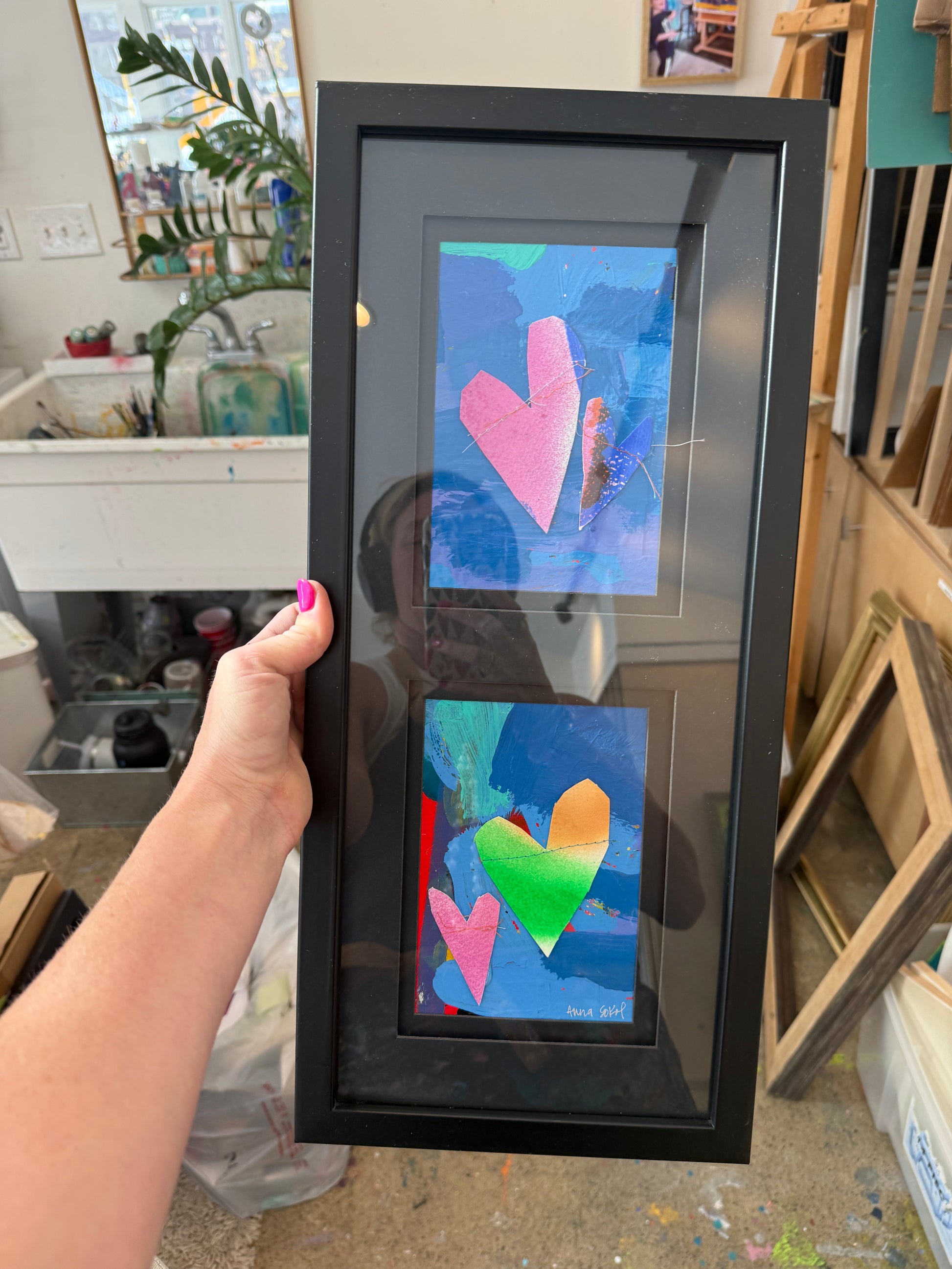 Two 5x7" mixed media collage on paper, framed to 9x20